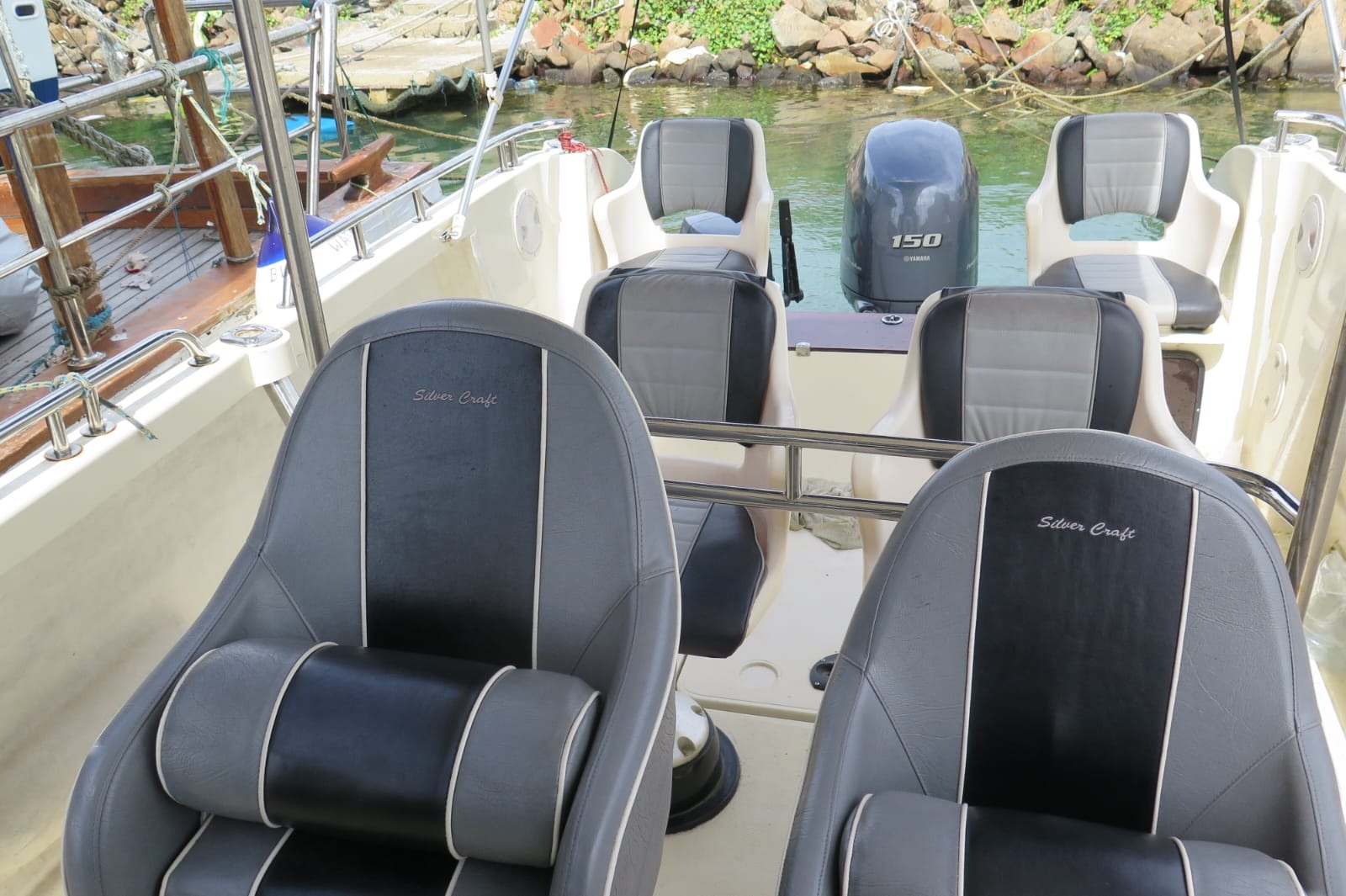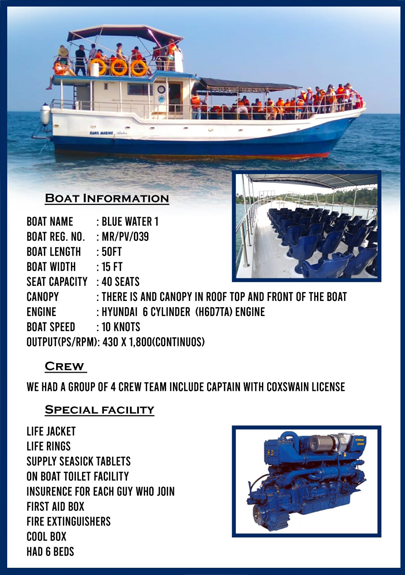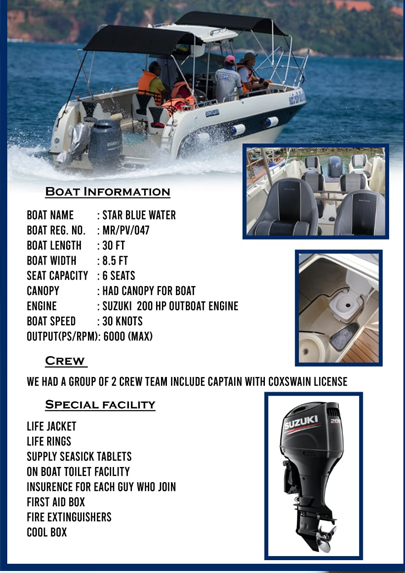 The Star Blue Water is a 30-ft boat with a 200 HP Suzuki engine, offering a smooth ride at up to 30 knots. It seats 6 passengers and comes with a canopy, onboard toilet, life jackets, seasick tablets, and a cool box. Operated by a licensed captain and crew, it ensures safety with first aid, fire extinguishers, and passenger insurance for every trip. Perfect for a safe and enjoyable adventure on the water!